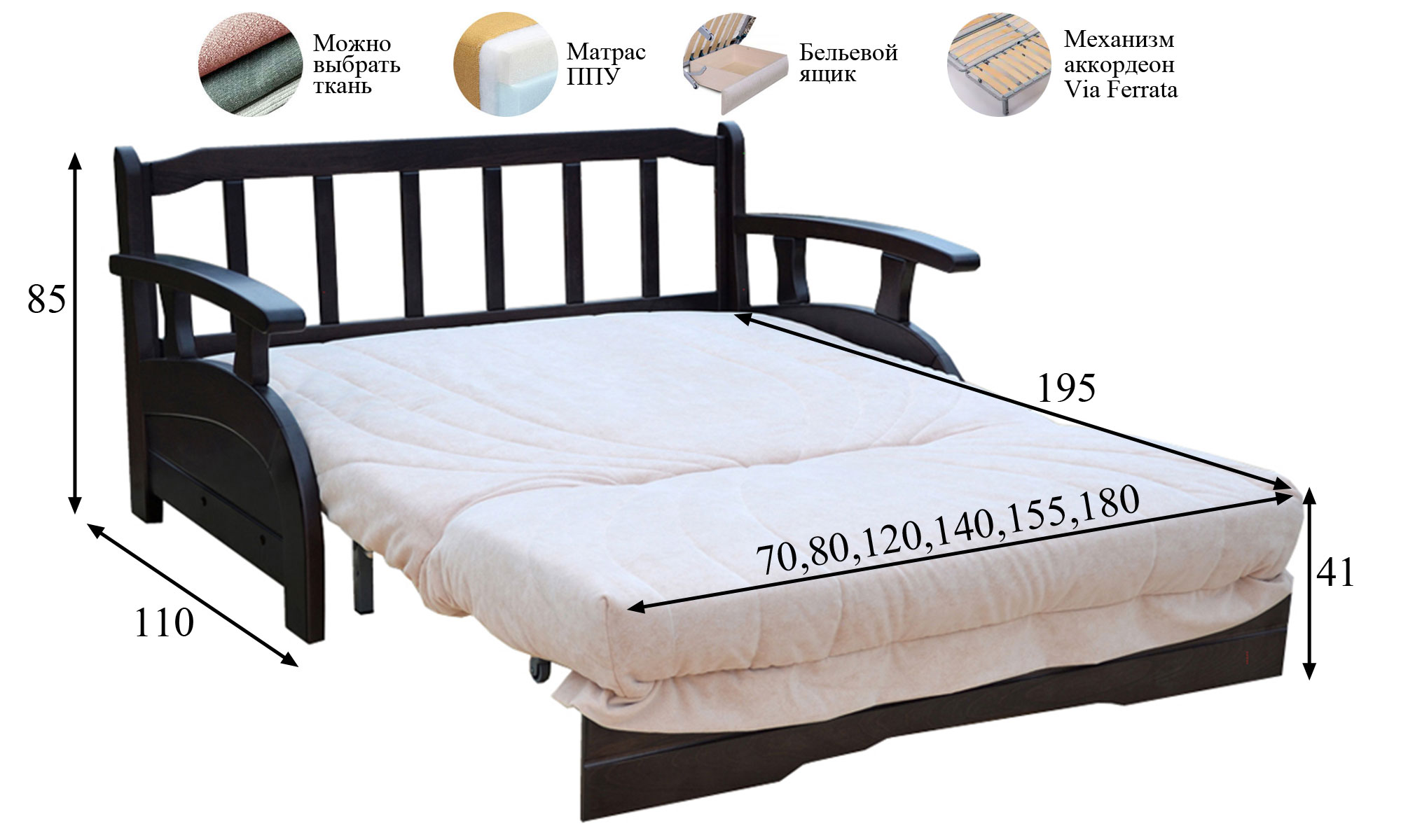 Cпальное место: 70, 80, 120, 140, 155, 180 х 195 см