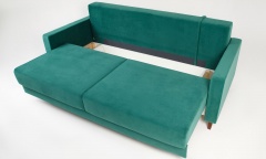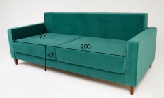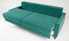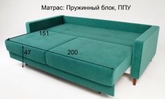 Удобный элегантный диван, механизм шагающий пантограф позволяет простым движением раскладывать диван в удобное двухспальное место. Бельевой ящик ламинированный, вместительный. Сзади дивана имеется дополнительная защитная (от стены), опорная спинка. Мягкие приспинные подушки с наполнением синтепух/синтешар дарят дополнительный комфорт. Легкость и невесомость дивану придают изящные деревянные опоры, цвет которых можно выбрать по желанию (венге, орех, натуральный, крем, белый).