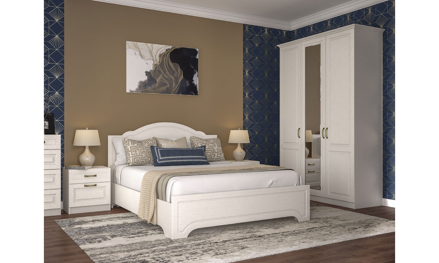 Популярный колониальный стиль, хорошо зарекомендовавший себя в гостиных, теперь доступен и для спальни. Эти модули подходят к модулям гостиной и прихожей Ливерпуль, делаются в тех же декорах, в том же стиле и могут компоноваться друг с другом. Комплект карнизов в комплектацию к шкафам не входит.