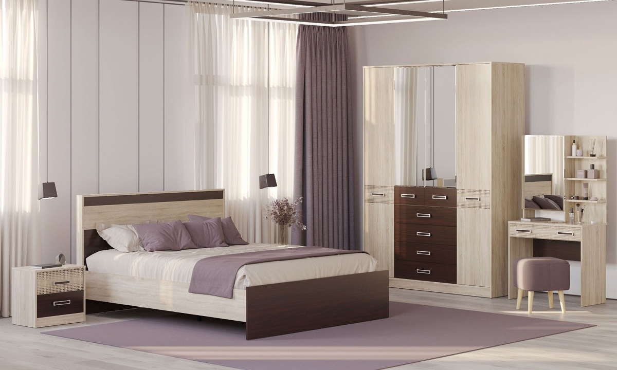 Спальня Румба выполнена в сочетании цветов Дуб Сонома + Венге, на фасады нанесена принтерная печать.