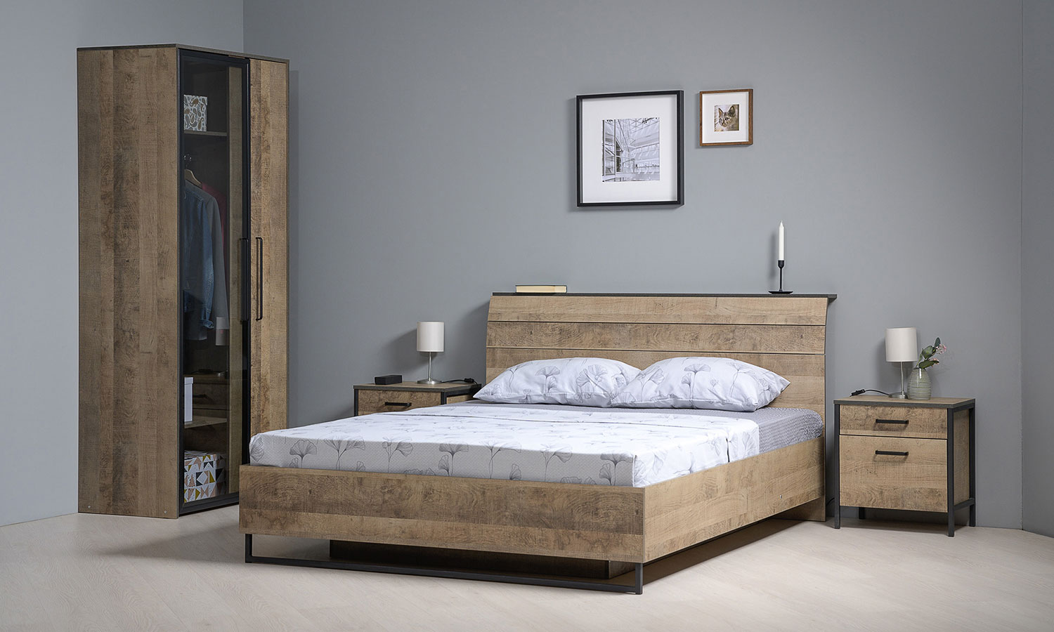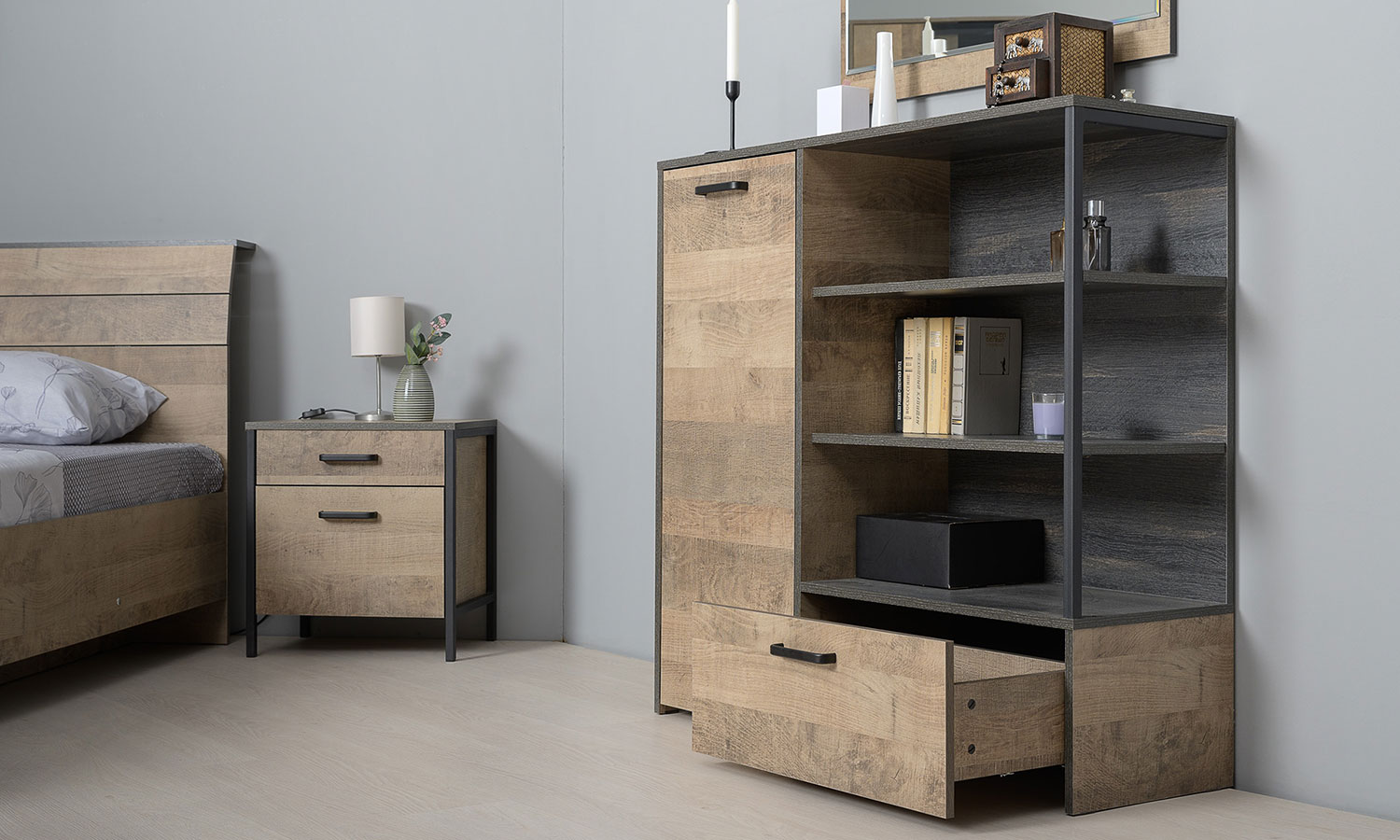 Лицевая фурнитура с тем же покрытием придаёт мебели индустриальную эстетику.
