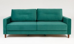 Удобный элегантный диван, механизм шагающий пантограф позволяет простым движением раскладывать диван в удобное двухспальное место. Бельевой ящик ламинированный, вместительный. Сзади дивана имеется дополнительная защитная (от стены), опорная спинка. Мягкие приспинные подушки с наполнением синтепух/синтешар дарят дополнительный комфорт. Легкость и невесомость дивану придают изящные деревянные опоры, цвет которых можно выбрать по желанию (венге, орех, натуральный, крем, белый).