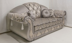 Диван Версаль 150ТТ выполнен в изящном классическом стиле, отличается изысканной формой и может стать украшением любой гостиной. Сочетание разных фактур ткани (жаккард, велюр, бархат), нежная бахрома, декоративные шнуры и кисти, придают этому дивану особый и неповторимый шарм. Матрас ортопедический - независимый пружинный блок (НПБ 80мм + ППУ 30мм + Синтепон 100г/м2) делает посадку удобной и комфортной. В основании сиденья используется мебельный щит (рамка из бруса + фанера). Механизм трансформации "высоковыкатной" одним движением превращает диван в просторную кровать, что позволяет использовать мебель в качестве полноценной кровати для ежедневного сна. Каркасная часть дивана изготовлена из массива сосны. Модель дивана можно доукомплектовать креслом. Диван полностью разборный, это позволяет без труда занести мебель практически в любое помещение. Комплектуется двумя квадратными и двумя круглыми подушками-думками. Выбор обивочной ткани всегда остаётся на усмотрение покупателя. Глубина дивана в разложенном состоянии со спинкой 240 см.