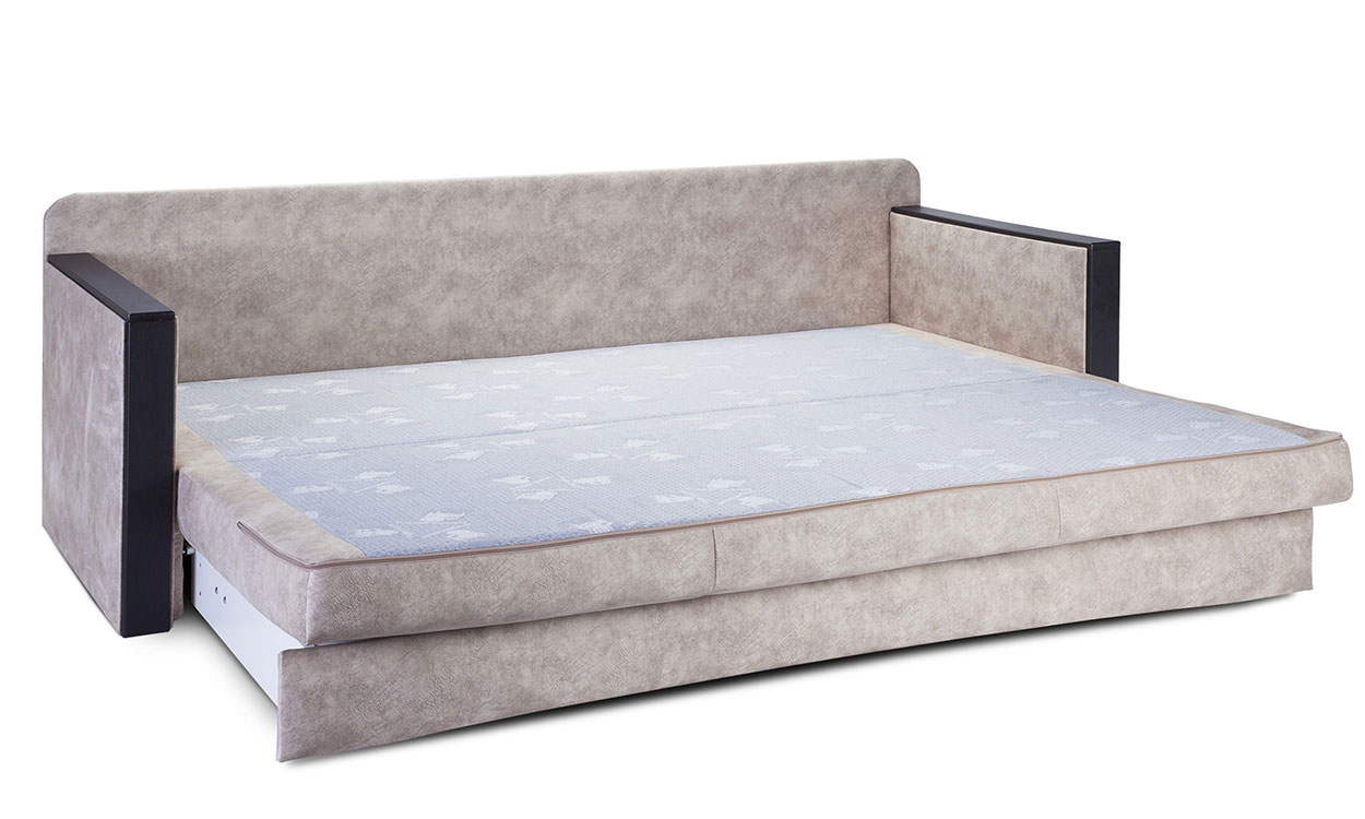 В этой модели простой в использовании механизм трансформации, который выдвигается при помощи колёсиков. Верхний матрас из независимых пружин (10см), а нижний матрас из ППУ (8см) повышенной плотности. Бельевой ящик изготовлен из ламинированной ДСП. Подушки: в комплекте 3 приспинные и 2 маленькие подушки. Декоративные накладки на подлокотниках из МДФ. Цвет накладок которые можно заказать: Карпатская ель (бежевый), Рельеф пастель (белый) и Венге (черный).