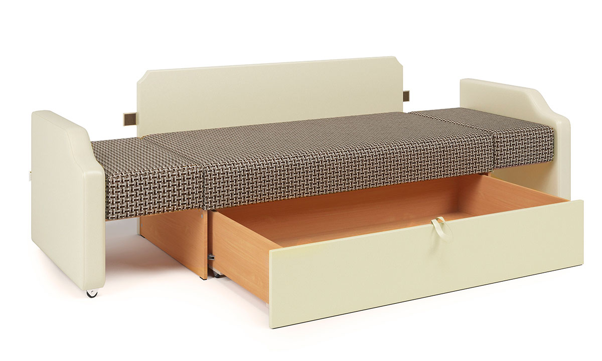 Кушетка Малыш с подлокотниками шириной 10 см. Кушетка может трансформироваться в три длины спального места: 128/163/198 см. Высота ящика 24 см. Твердый улучшенный ППУ ST3542 +2000 руб.