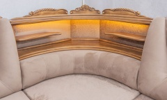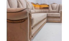 Традиционная классическая модель углового дивана модель К с элементами декора Лоренс, изящным баром с подсветкой и полочками. Механизм трансформации - дельфин, в наполнении матраса используются независимый пружинный блок и высокоэластичная пена (НПБ 80мм + ППУ 30мм + Синтепон 100г/м2). В основании сиденья используется мебельный щит (Рамка из бруса + Фанера). Каркасная часть выполнена из массива сосны. В кресельном модуле и угловой части дивана размещены ящики для белья. Диван может быть изготовлен с заменой бара на мягкий угол. Покупателю на выбор предлагается 6 вариантов декоров. Модель может быть доукомплектована креслом и креслом-кроватью. Диван полностью разборный, это позволяет без труда занести мебель практически в любое помещение. Выбор ткани всегда остаётся на усмотрение клиента. Маленькие подушки входят в стандартную комплектацию. Высота подлокотников 57 см.