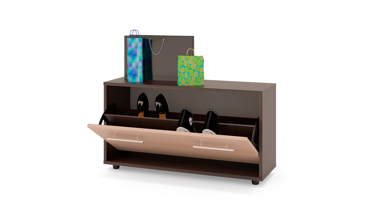 Широкая низкая тумба для обуви. Дверь оснащена откидывающимся механизмом со специальными полками для размещения обуви. Обувница изготовлена из высококачественной ДСП 16 мм, края отделаны кромкой ПВХ 0.4мм.