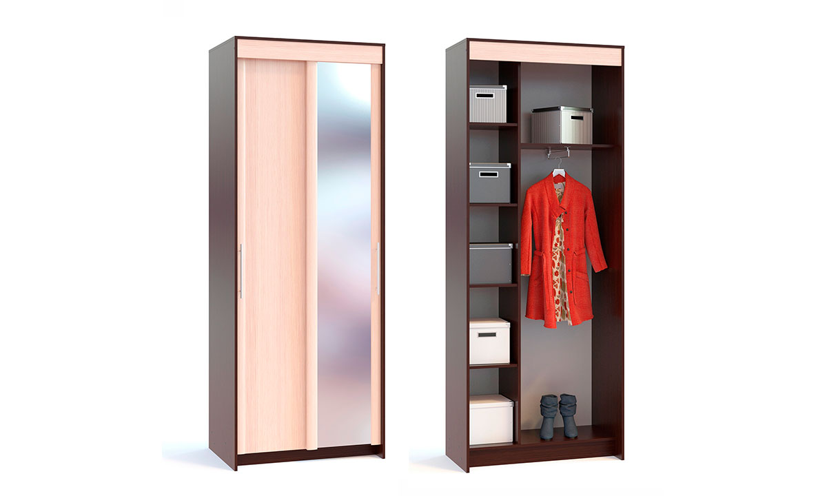 Шкаф для одежды с дверцами купе прекрасно подойдет для меблировки прихожей или спальни. Одна из дверей оснащена просторным зеркалом. Этот вместительный шкаф имеет штангу для одежды, несъемную полку для шляп и 4 съемные полки.
