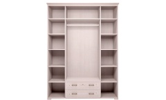 Шкаф сделан в стиле прованс, дополнен состаренными фигурными ручками. Центральная секция имеет металлическую штангу для одежды на плечиках. Две боковые секции имеют глубокие полки для хранения. В нижней секции находятся два выдвижных ящика. На центральных дверцах имеются зеркала. Для более изящного облика шкаф можно укомплектовать карнизами К1/02 Афродита.