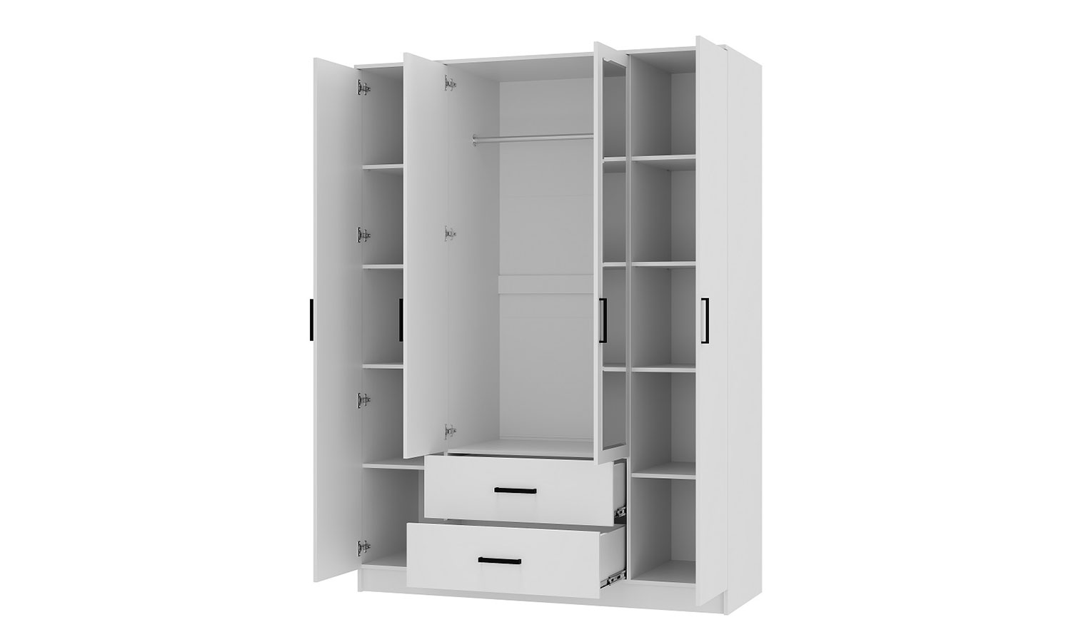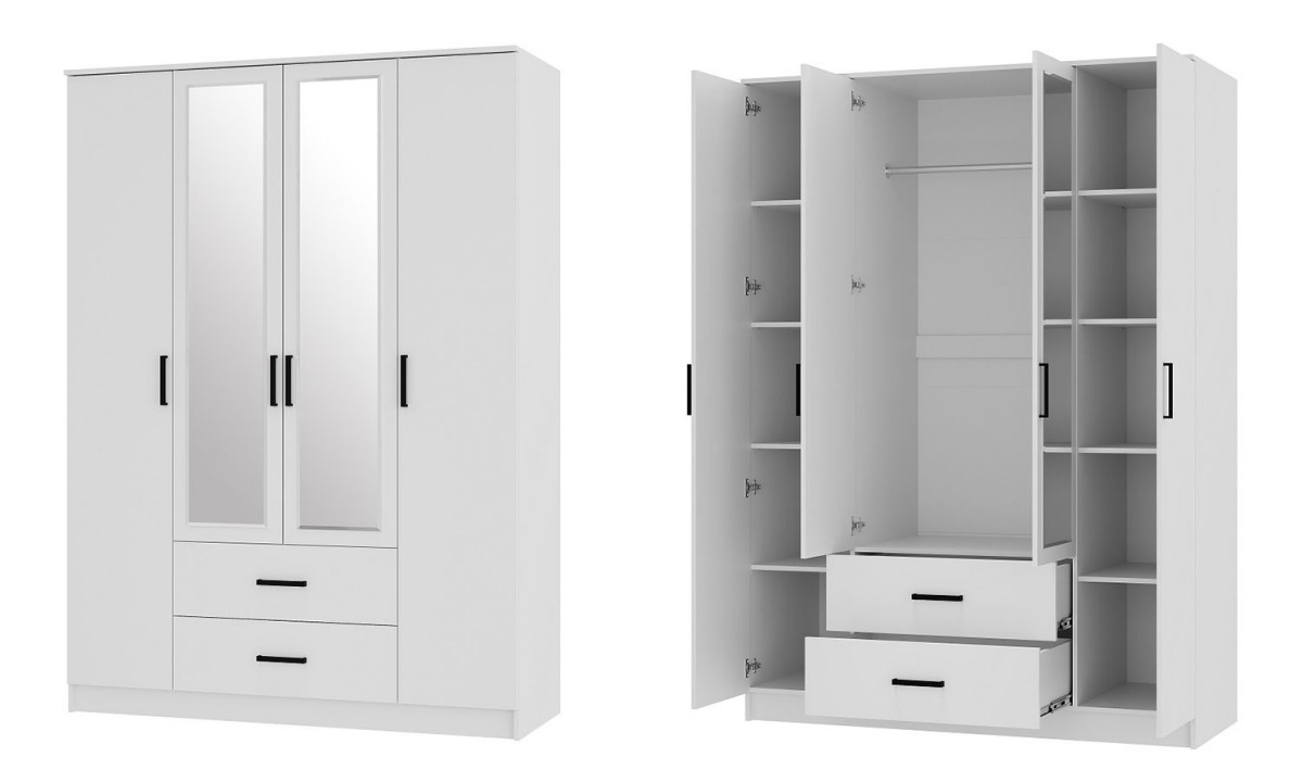 Коллекция мебели для спальни Фьюжн является воплощением эстетики минимализма. Белый цвет в сочетании с черной фурнитурой, строгие линии, простой конструктив – все это лучшие черты мебельного дизайна. Вместительный 4-х дверный шкаф - универсальное решение для организации хранения одежды в спальне или прихожей. Модуль оснащен стационарной штангой для хранения одежды на плечиках, двумя выкатными ящиками и набором полок. Зеркальный фасад визуально облегчает конструкцию шкафа и добавляет воздуха интерьеру, в котором он расположен.