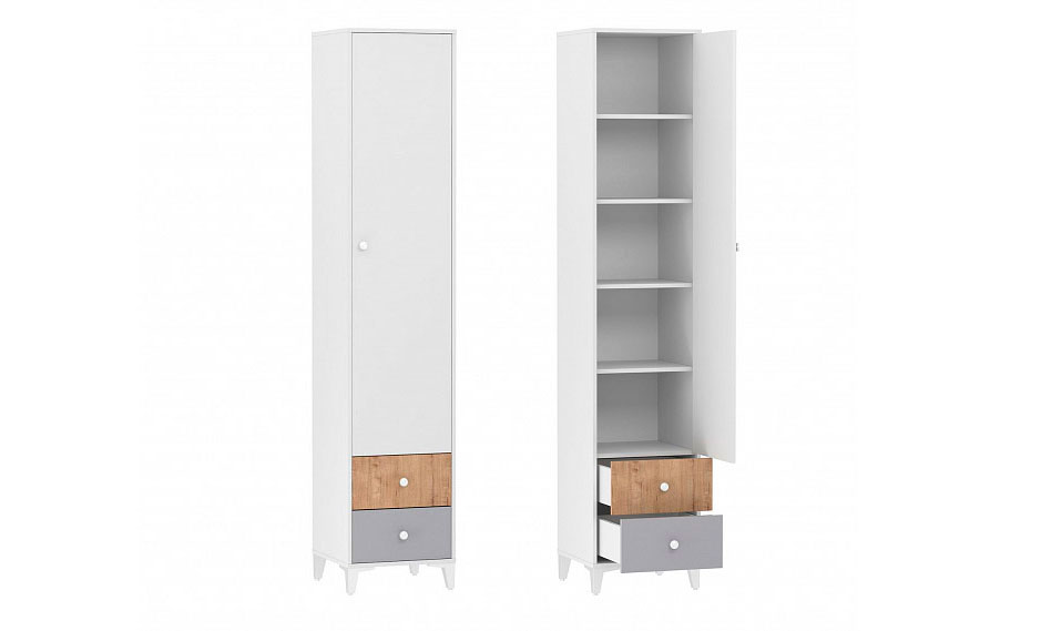 Шкаф-пенал «Морти» – комбинированный одностворчатый шкаф с полками для белья за распашной дверцей и двумя небольшими выдвижными ящиками в основании. Вы можете легко вписать этот предмет интерьера в любое пространство любой площади. Выдвижные ящики с фасадами в модных, спокойных оттенках, характерных для скандинавского стиля и спокойного современного интерьера оснащены шариковыми направляющими. Шариковые направляющие полного выдвижения равномерно распределяют вес содержимого и обеспечивают плавный бесшумный ход ящика. Высокие регулируемые опоры зрительно облегчает конструкцию и делает процесс уборки удобным. Круглые ручки отлично подходят для данной модели.