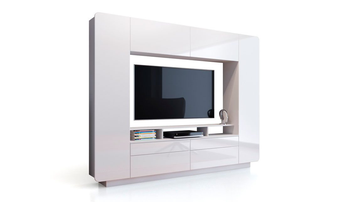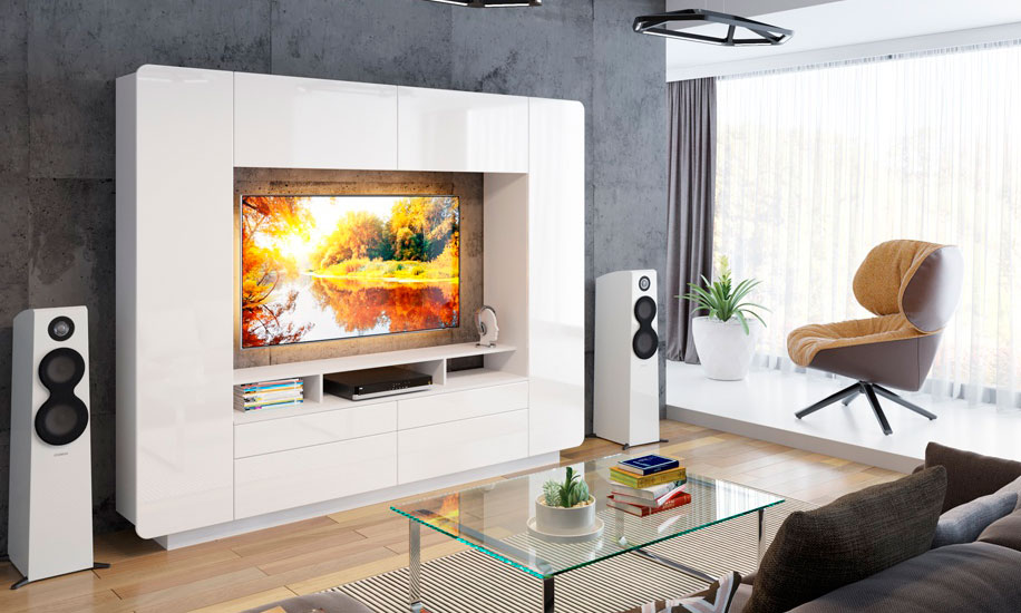 Гостиная "Нео белая" выполняется в белом цвете корпуса и с белыми глянцевыми фасадами из МДФ. В стенке есть все необходимое: отделение для телевизора с диагональю до 60 дюймов (160 см); два вместительных стеллажа, две полки и четыре выдвижных ящика, которые открываются с помощью системы Push to open (открытие при нажатии на фасад). Есть вариант с черными глянцевыми фасадами.