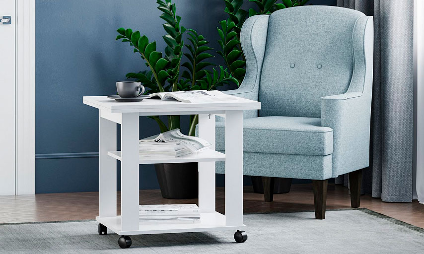 Благодаря поворотному механизму и подвижному соединению столешниц его можно раскладывать для увеличения площади. Если планируется частое использование мебели в различных комнатах, то колеса облегчат перемещение. Все механизмы конструкции обладают простым использованием.