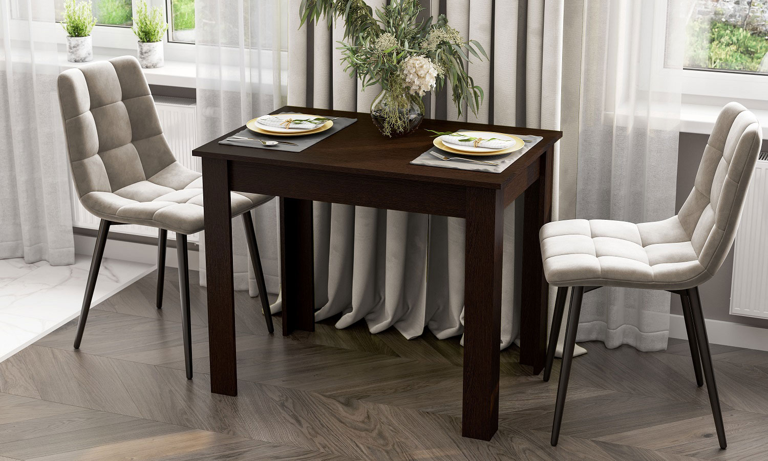 Отличается небольшими габаритами, устойчивыми опорами, противоударной столешницей, которая также не боится влаги, и приятным декором на выбор. За счет универсального исполнения модель будет актуально смотреться в любом по стилю интерьере, от классического до ультрасовременного. А ее размеры позволят Вам организовать обеденную зону для двоих даже в малогабаритке или квартире-студии.